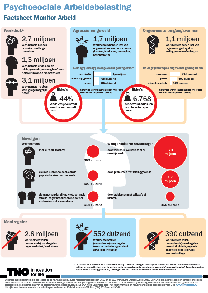 Uit onderzoek blijkt dat veel mensen een hoge arbeidsbelasting ervaren en onvoldoende steun voelen van hun manager. Onderzoek van TNO laat zien dat veel medewerkers een te hoge werkdruk en onvoldoende steun ervaren. Als deze cijfers kloppen (en dat doen ze) is er nogal wat aan de hand. In de factsheet Psychosociale arbeidsbelasting van TNO kun je zien hoe groot de onvrede is. | |