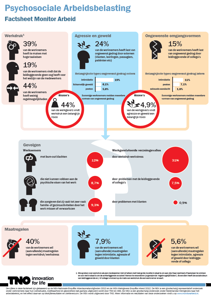 Uit onderzoek blijkt dat veel mensen een hoge arbeidsbelasting ervaren en onvoldoende steun voelen van hun manager. Onderzoek van TNO laat zien dat veel medewerkers een te hoge werkdruk en onvoldoende steun ervaren. Als deze cijfers kloppen (en dat doen ze) is er nogal wat aan de hand. In de factsheet Psychosociale arbeidsbelasting van TNO kun je zien hoe groot de onvrede is. | |
